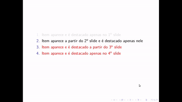 \item<4> \alert<4>{Item aparece e é destacado apenas no 4º slide}