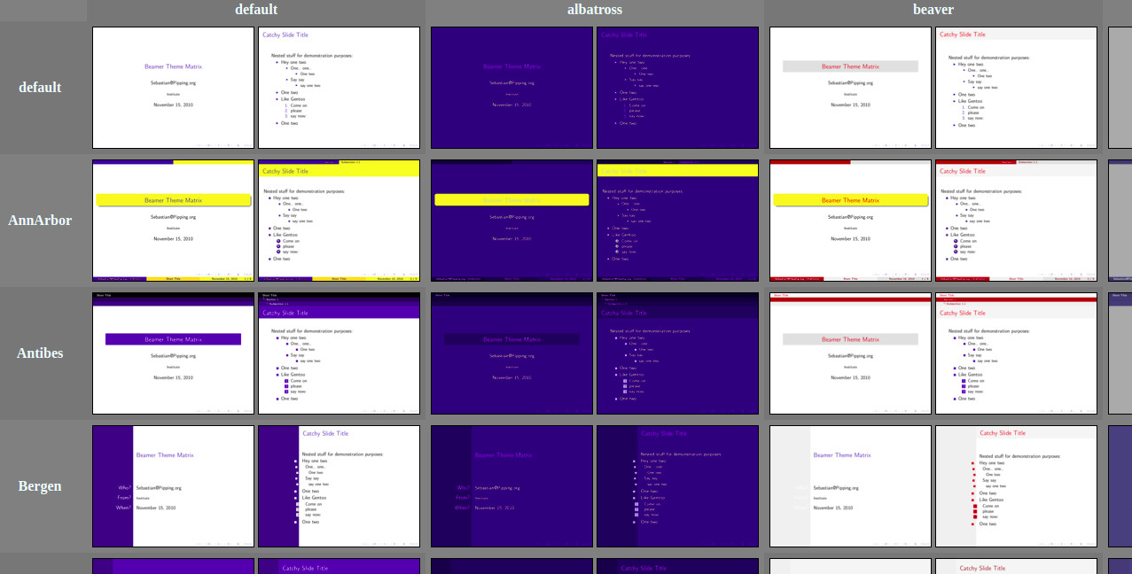 O Beamer contém vários temas. Temas modificam a aparência da sua apresentação. Você pode ver vários temas do Beamer aqui.