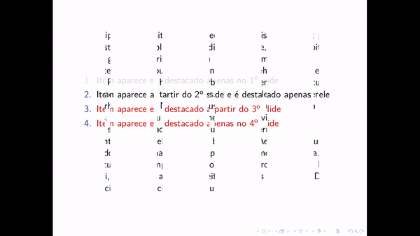\item<3-> \alert<3->{Item aparece e é destacado a partir do 3º slide}