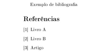 O exemplo acima assume que há um arquivo bibliografia.bib com a bibliografia que será usada no documento. A extensão .bib não deve ser colocada.