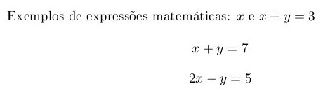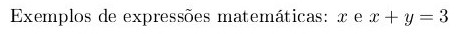 Exemplos de expressões matemáticas: \( x \) e \( x + y = 3 \)