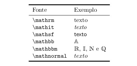 Às vezes, você pode precisar incluir texto em uma expressão matemática, ou formatar um símbolo com uma fonte diferente. Há comandos de fontes específicos para o modo matemático que você pode usar para isso: