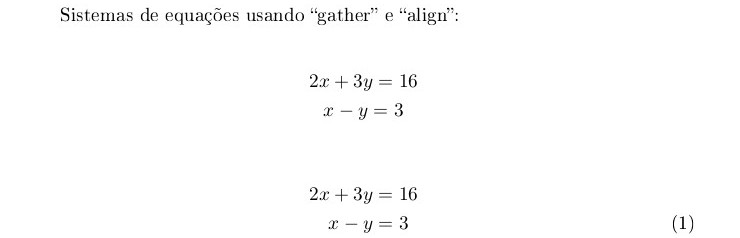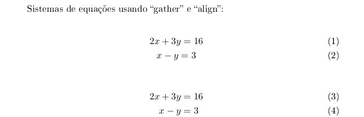 Note que as equações do segundo sistema ficaram alinhadas no sinal de igual. No ambiente align, dá para