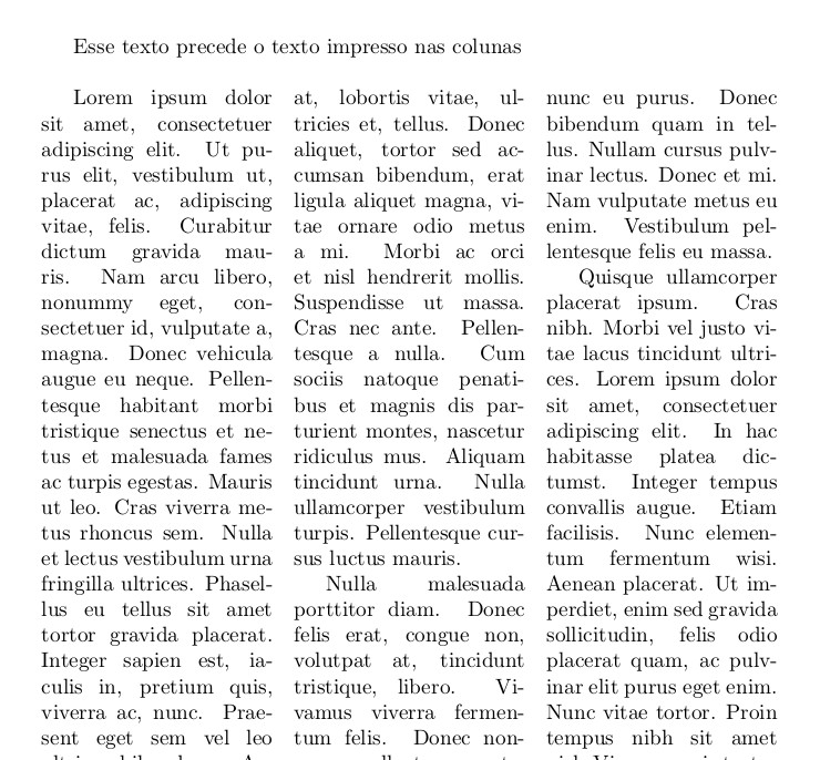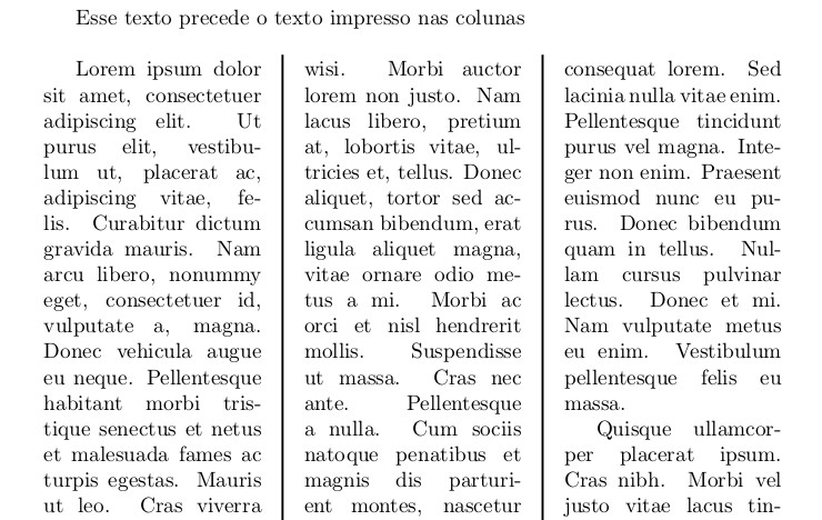 \begin{multicols}{3}[Esse texto precede o texto impresso nas colunas]